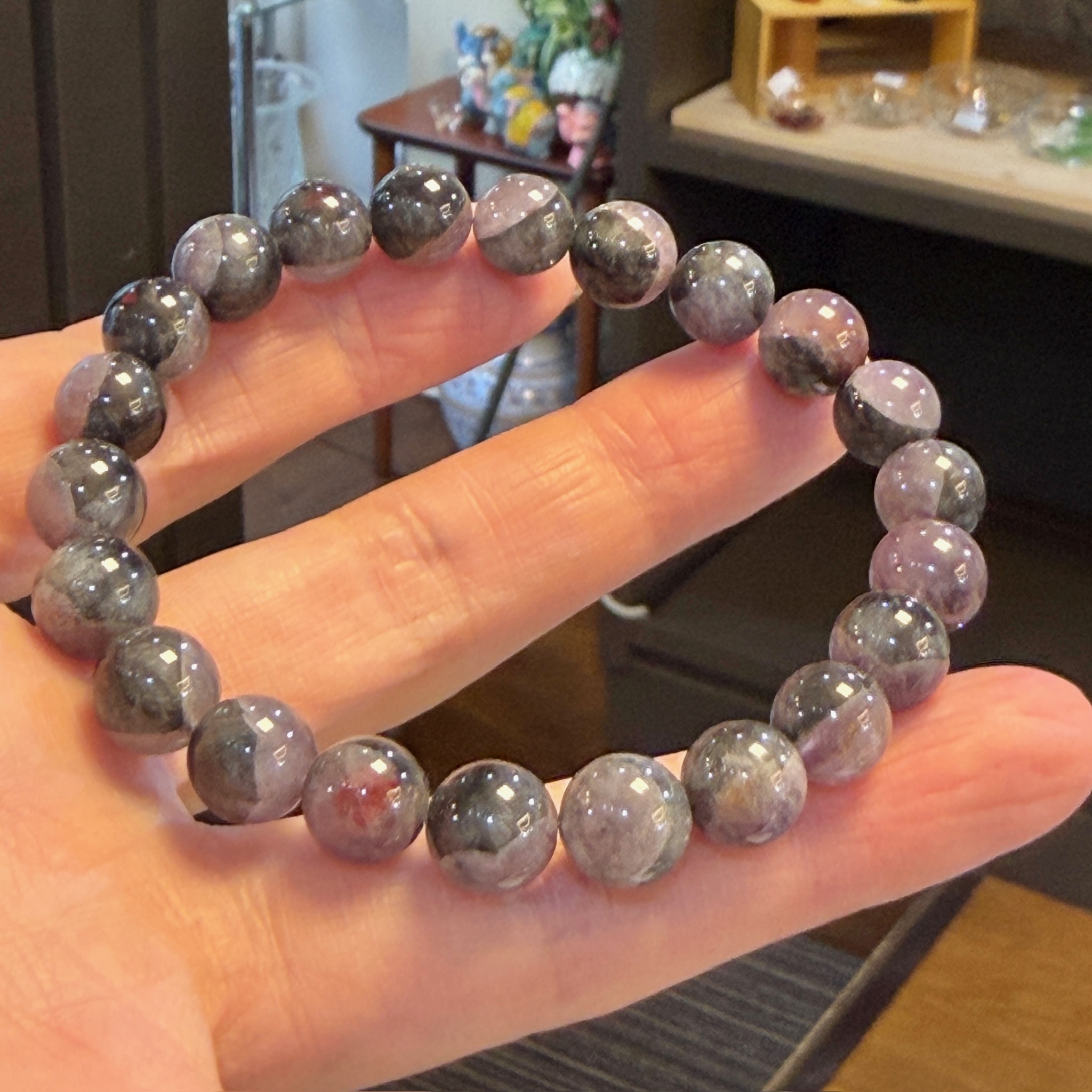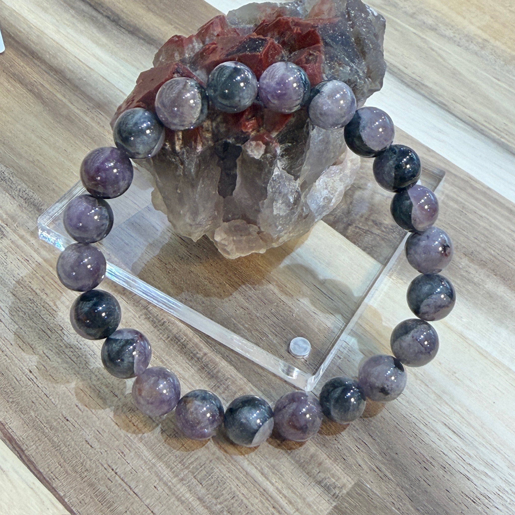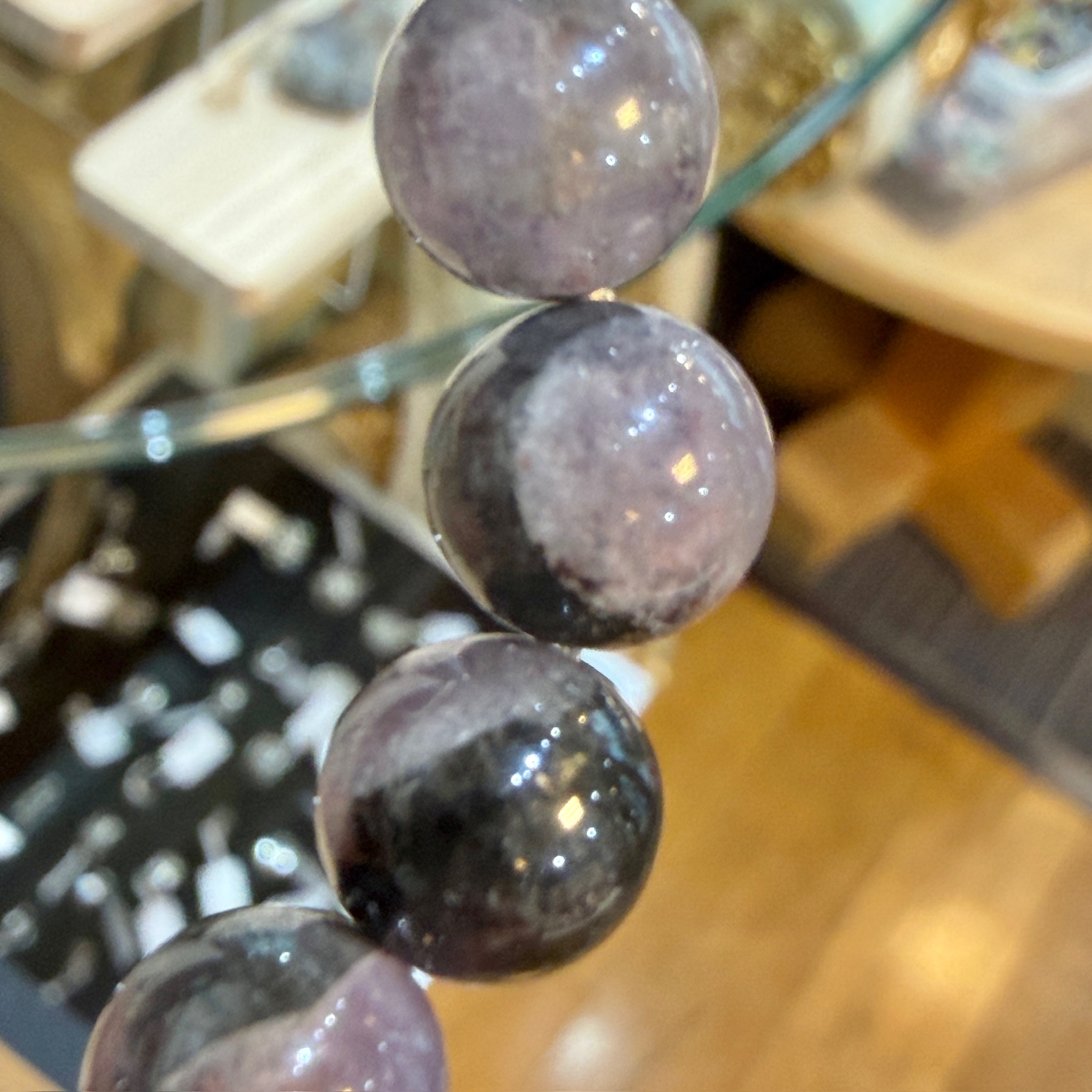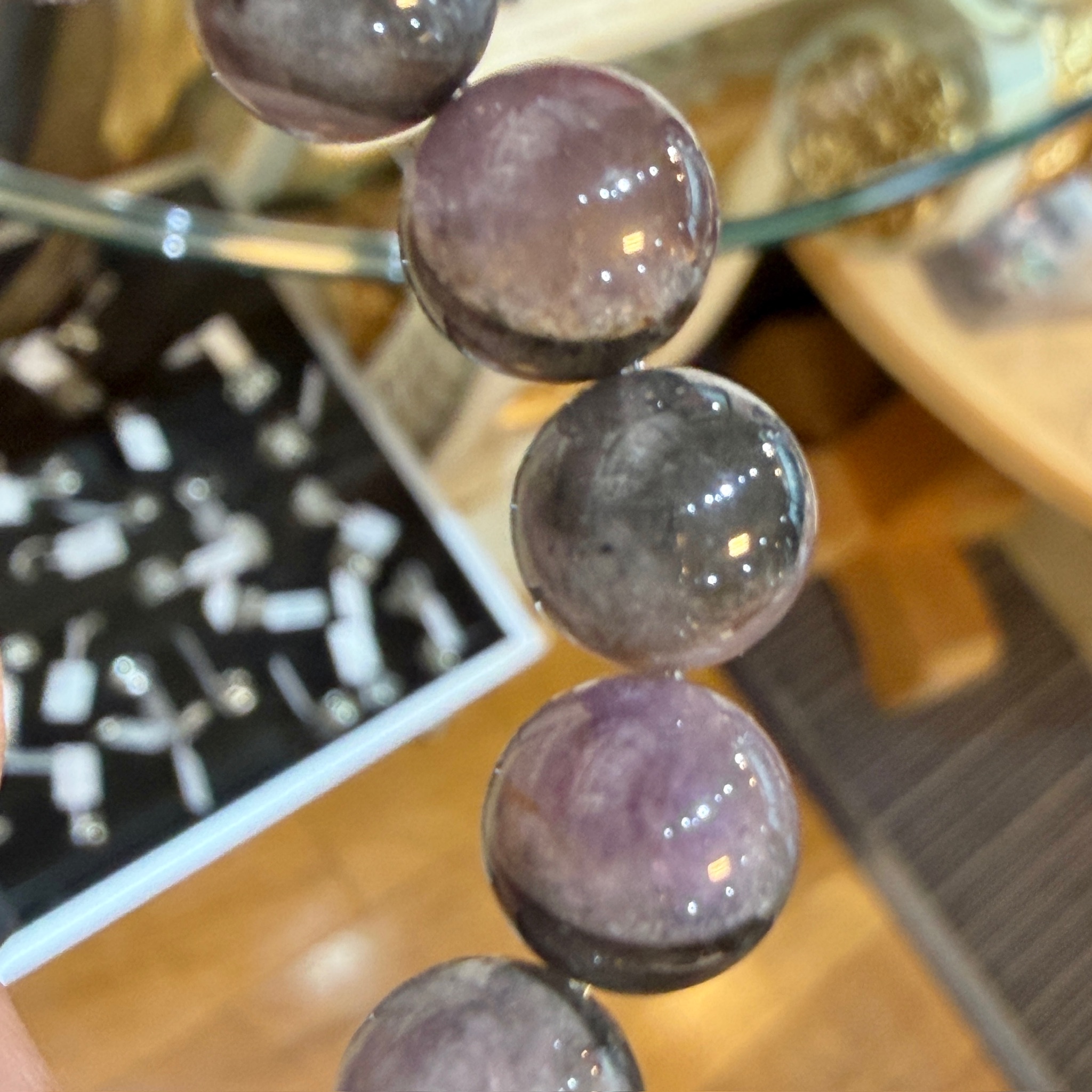 黒みが強すぎる粒が少なく、紫の発色も極端に淡くないため、ブレスレットとして装着した際のバランスが良好です。