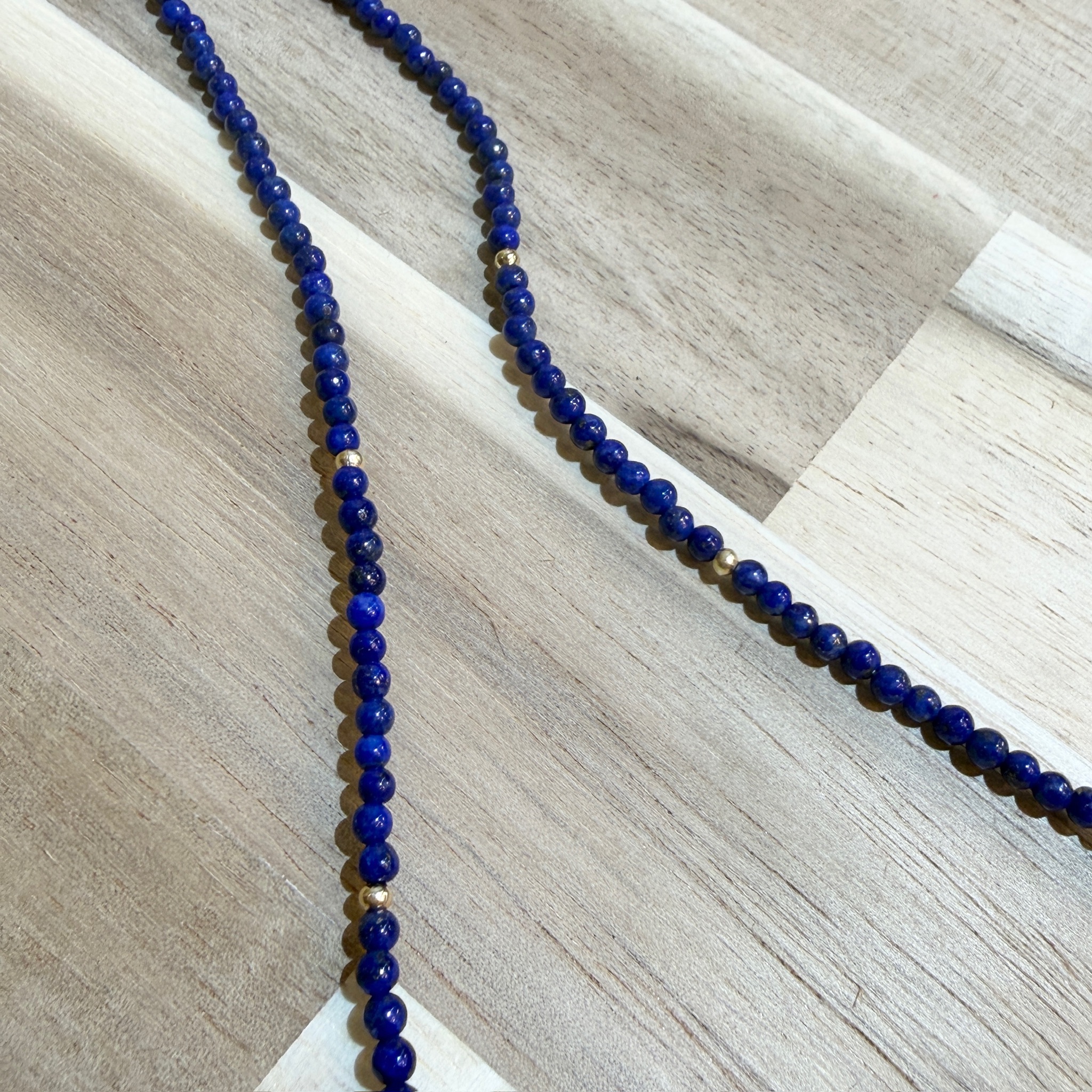 本品はネックレス部分に約2.7mmの小粒ラピスを連ね、