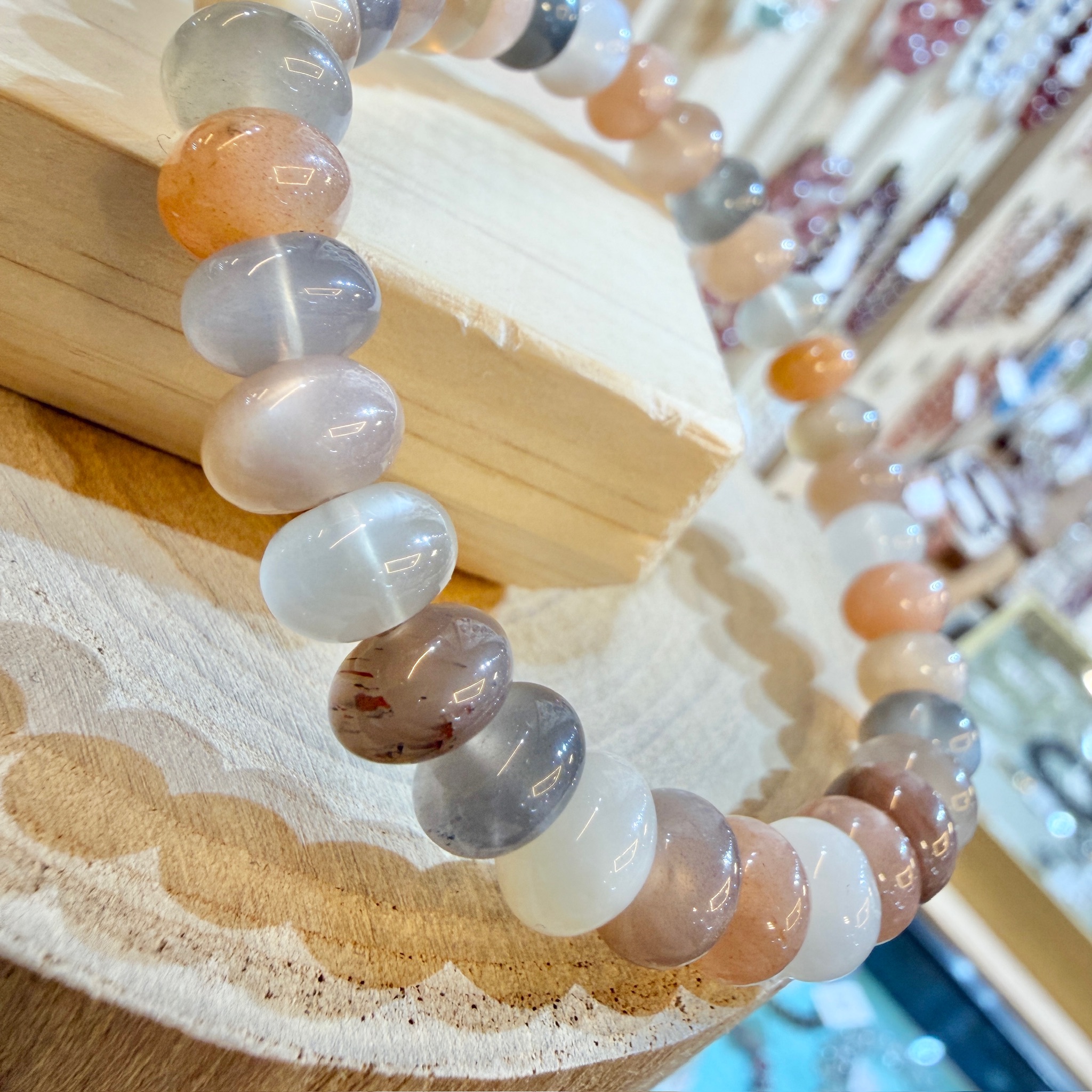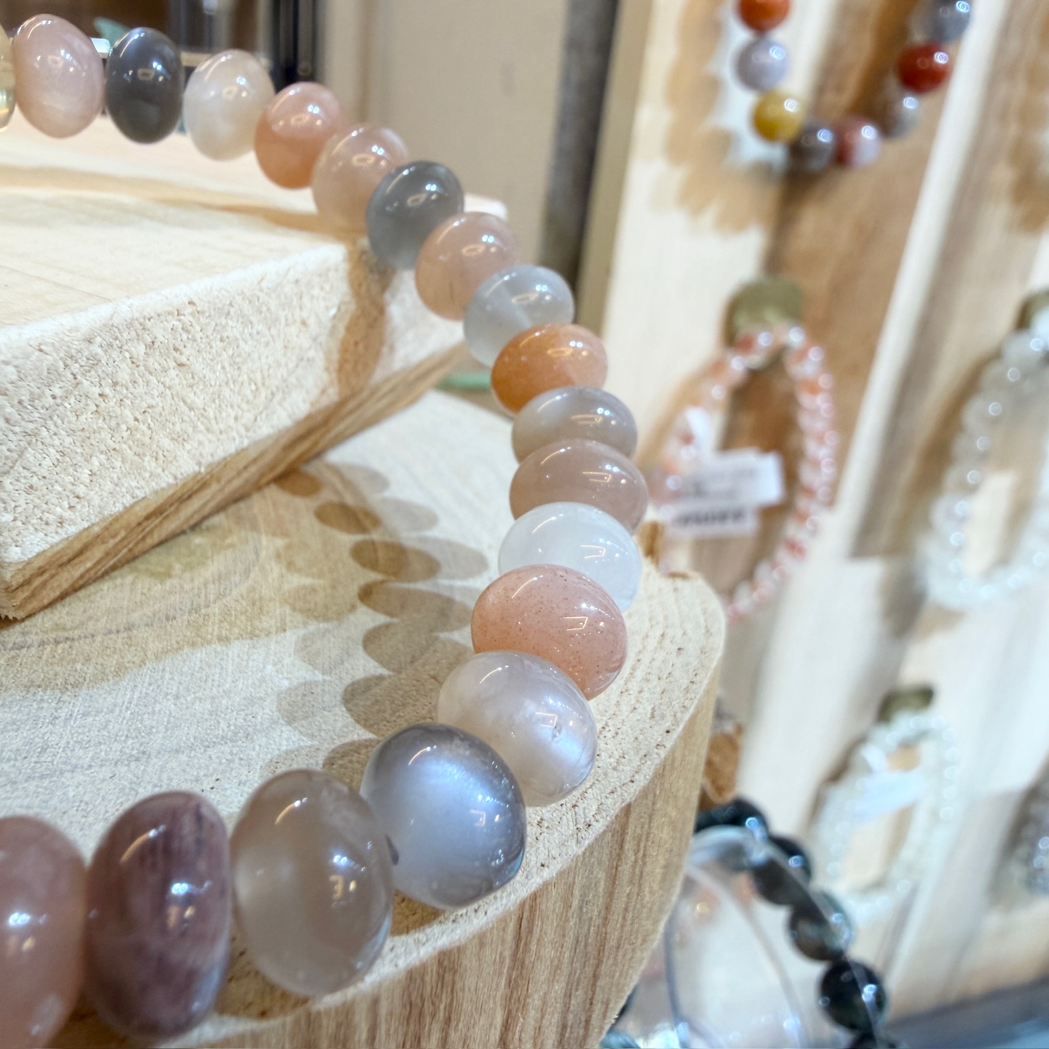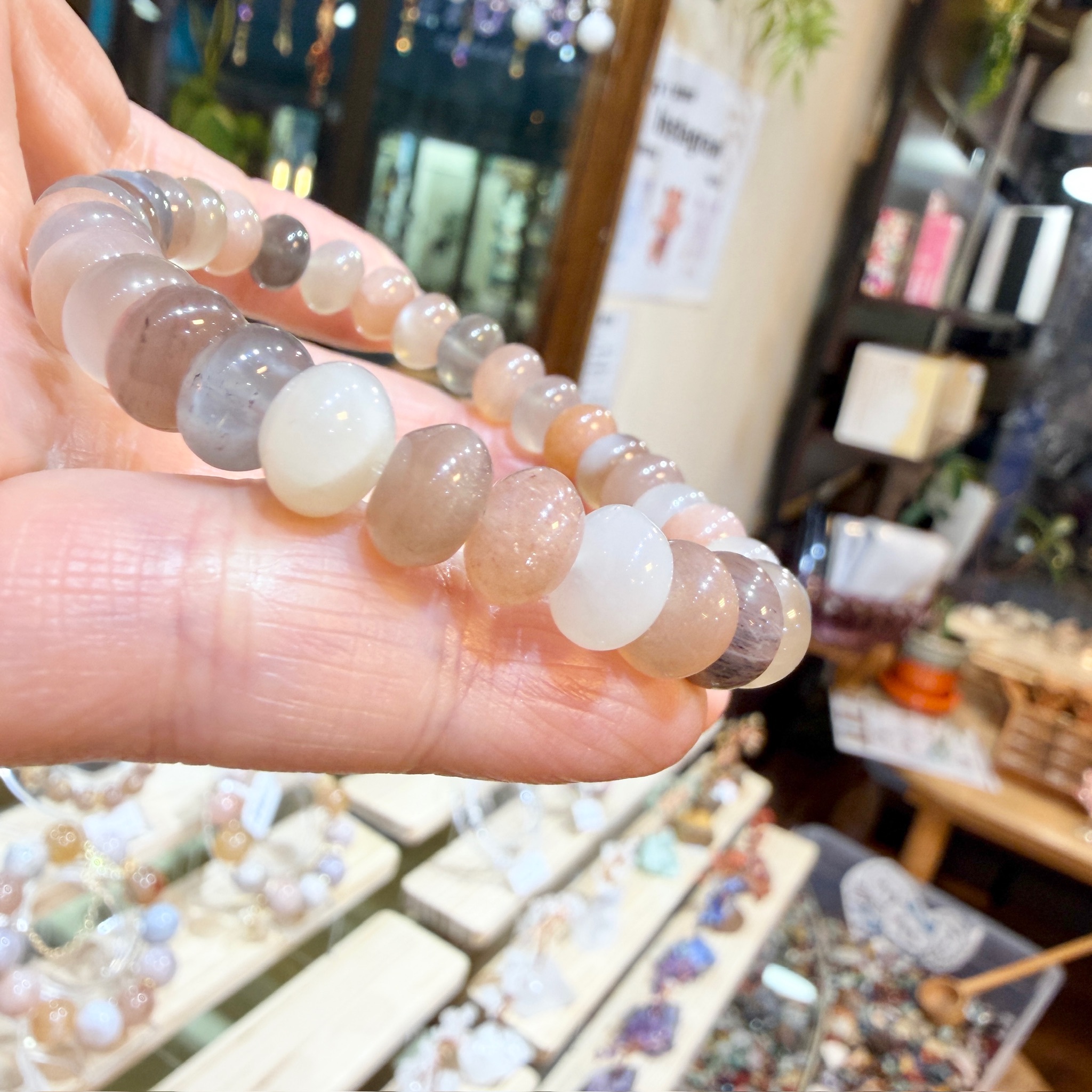 淡い乳白色からピーチ、グレーへと移ろう色合いが、一本の中にやさしく溶け合うサンムーンストーン。